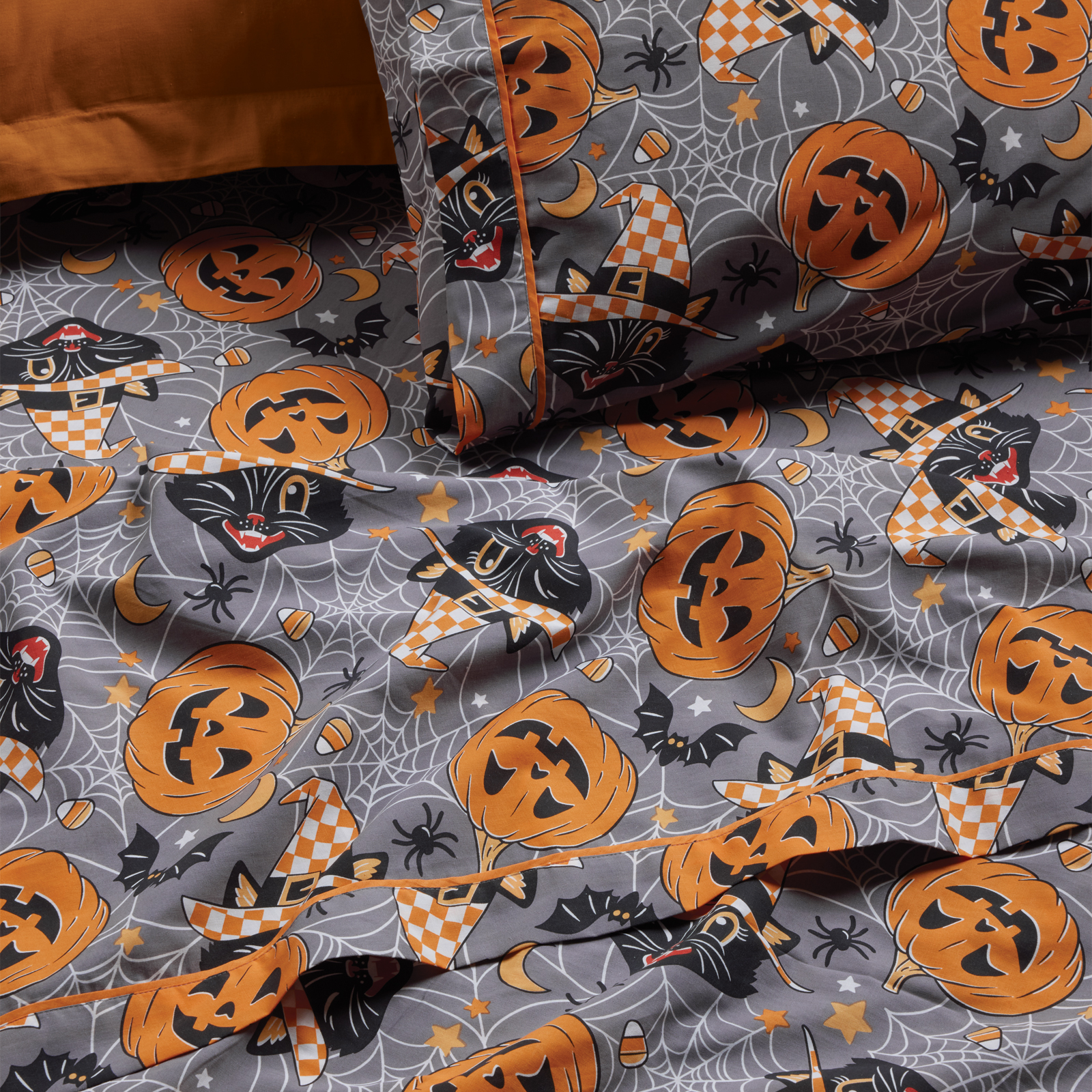 Σετ σεντόνια της σειράς Kid, σε σχέδιο Halloween. Είναι από 70% υποαλλεργικό βαμβάκι και 30% πολυεστέρα με πυκνότητα ύφανσης 150 TC, απαλό στην αφή & ανθεκτικό στη χρήση. Το σετ περιλαμβάνει ένα πανωσέντονο 170Χ260εκ, ένα κατωσέντονο 170X260εκ και μία μαξιλαροθήκη 50×70εκ. Das home…makes your house a home! Πλύσιμο στους 40°C. Όχι χρήση χλωρίου ή λευκαντικού. Σιδέρωμα σε μέτρια θερμοκρασία. Όχι στεγνό καθάρισμα.