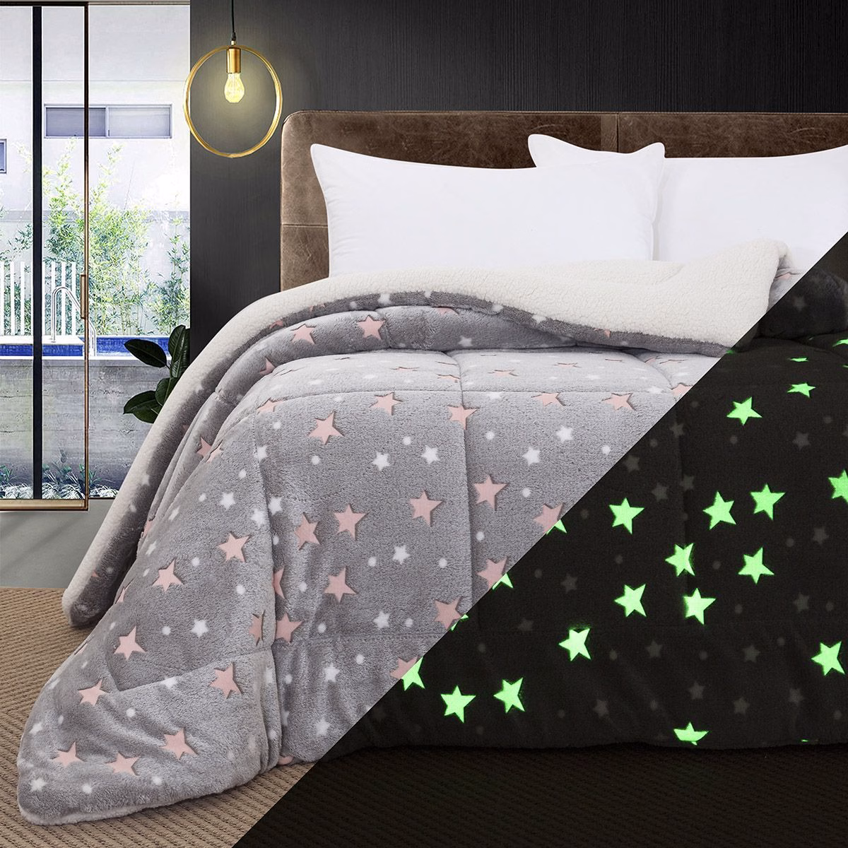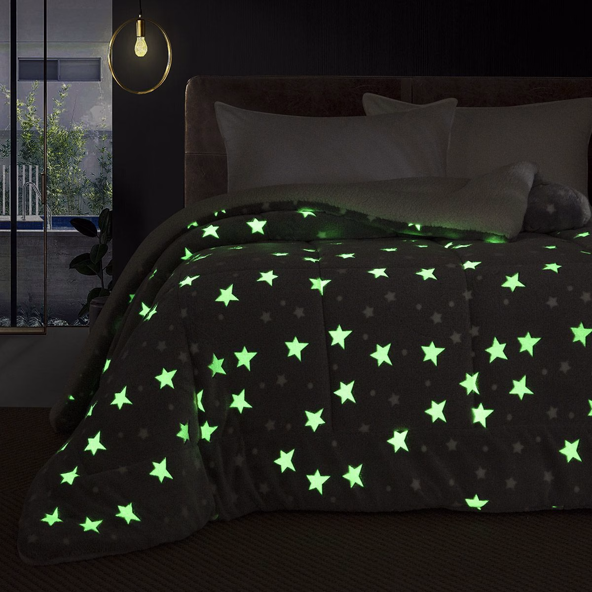 Χαρίστε χαμόγελα και ζεστασιά στα παιδιά με το φωσφοριζέ κουβερτοπάπλωμα Glow σε διάσταση 160×220 με sherpa. Η φωσφορίζουσα συλλογή περιλαμβάνει σεντόνια, κουβέρτες , παπλώματα και κουρτίνα. Τα παιδιά τα λατρεύουν κυριολεκτικά και είναι η ιδανική διακόσμηση κάθε παιδικού δωματίου! Προτείνεται η έκθεση σε φυσικό φως. Η ιδιαιτερότητα της φωσφόρισης αποκαλύπτεται σε απόλυτο σκοτάδι. Όσο πιο πολύ εκτεθεί στο φυσικό φως και όσο πιο πολύ είναι το σκοτάδι, τόσο περισσότερο θα φωσφορίζει!