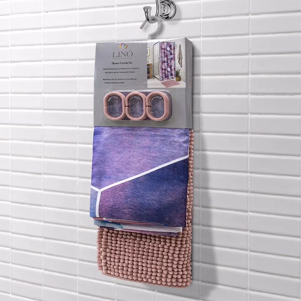Περιλαμβάνει μία κουρτίνα μπάνιου με δώδεκα πλαστικούς κρίκους