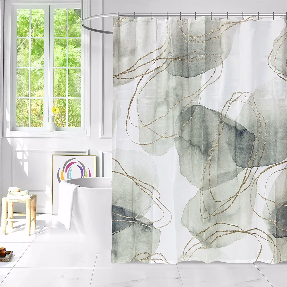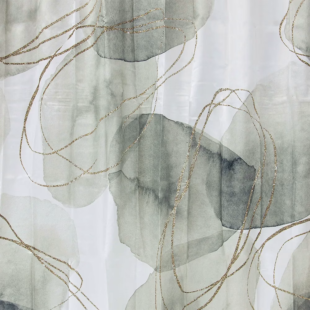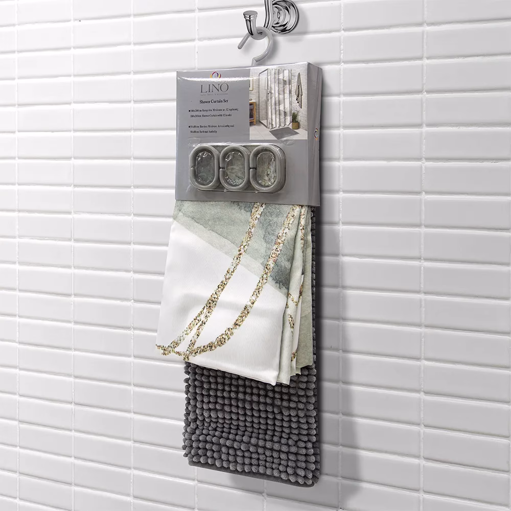 Περιλαμβάνει μία κουρτίνα μπάνιου με δώδεκα πλαστικούς κρίκους