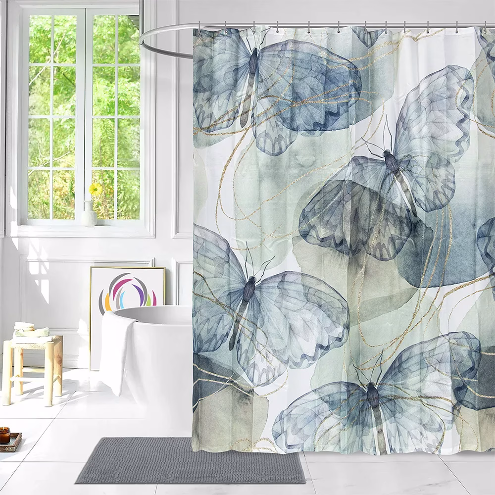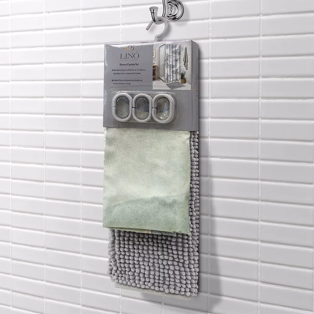 Περιλαμβάνει μία κουρτίνα μπάνιου με δώδεκα πλαστικούς κρίκους