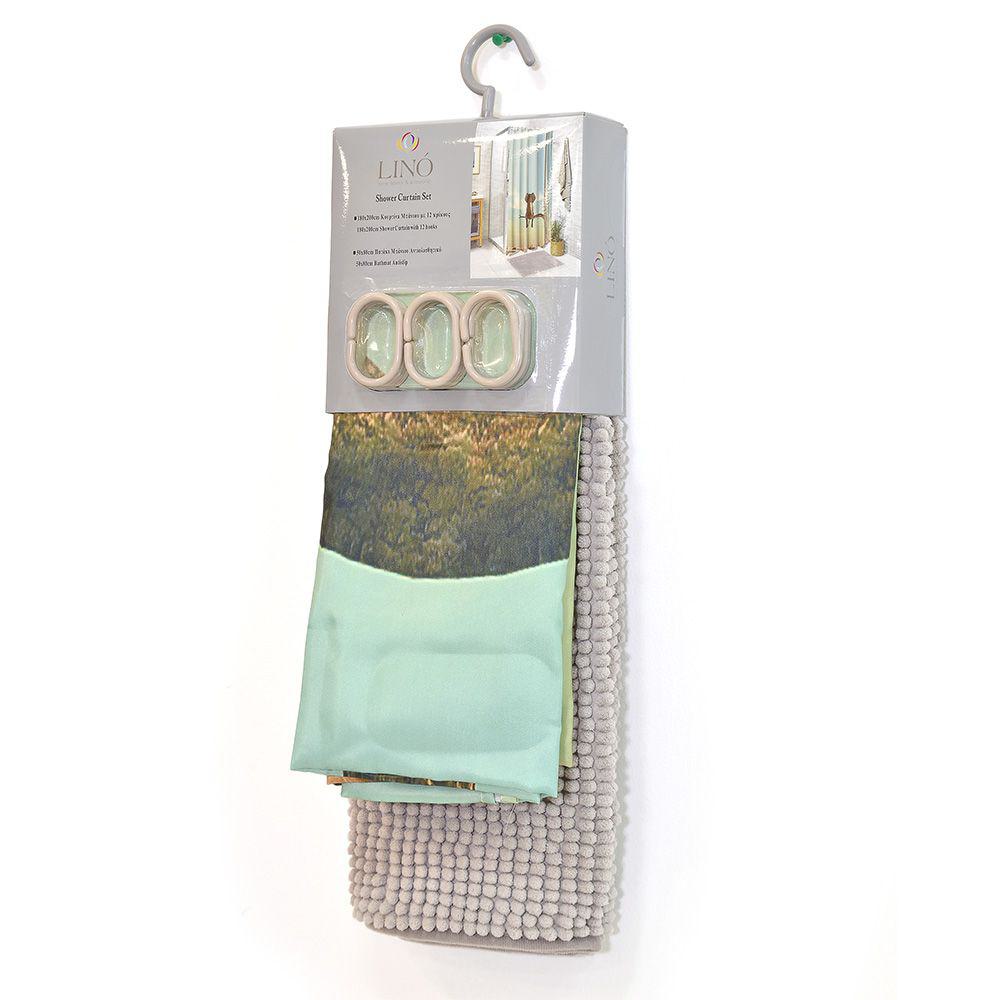 Περιλαμβάνει μία κουρτίνα μπάνιου με δώδεκα πλαστικούς κρίκους