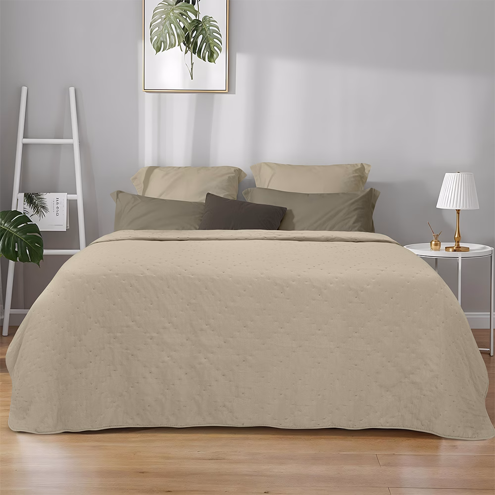 Υπέρδιπλο κουβερλί σε απόχρωση μπεζ με prewashed επεξεργασία για απαλή αίσθηση και μεγαλύτερη αντοχή. Το εξωτερικό ύφασμα είναι 100% microfiber (280gsm) και η γέμιση 100% polyester (100gr), προσφέροντας ανάλαφρο και δροσερό σκέπασμα. Με συνολικό βάρος (1480gr), είναι ιδανικό για τους ανοιξιάτικους και καλοκαιρινούς μήνες.