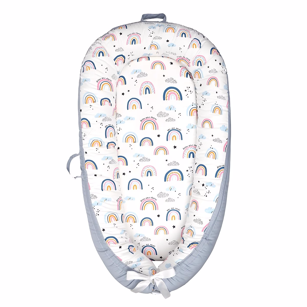 Φωλιά ύπνου Rainbow σε εκρού-γκρι αποχρώσεις, με σχέδιο ουράνιο τόξο από την εταιρεία Melinen! Είναι ιδανική για τον ύπνο του μωρού σας τους πρώτους μήνες. Το εξωτερικό κάλυμμα είναι από 100% βαμβάκι περκάλι και το στρώμα από 100% memory foam 3 cm. Διαθέτει κρυφό φερμουάρ ώστε το στρώμα να αφαιρείται γρήγορα και το κάλυμμα να πλένεται εύκολα.