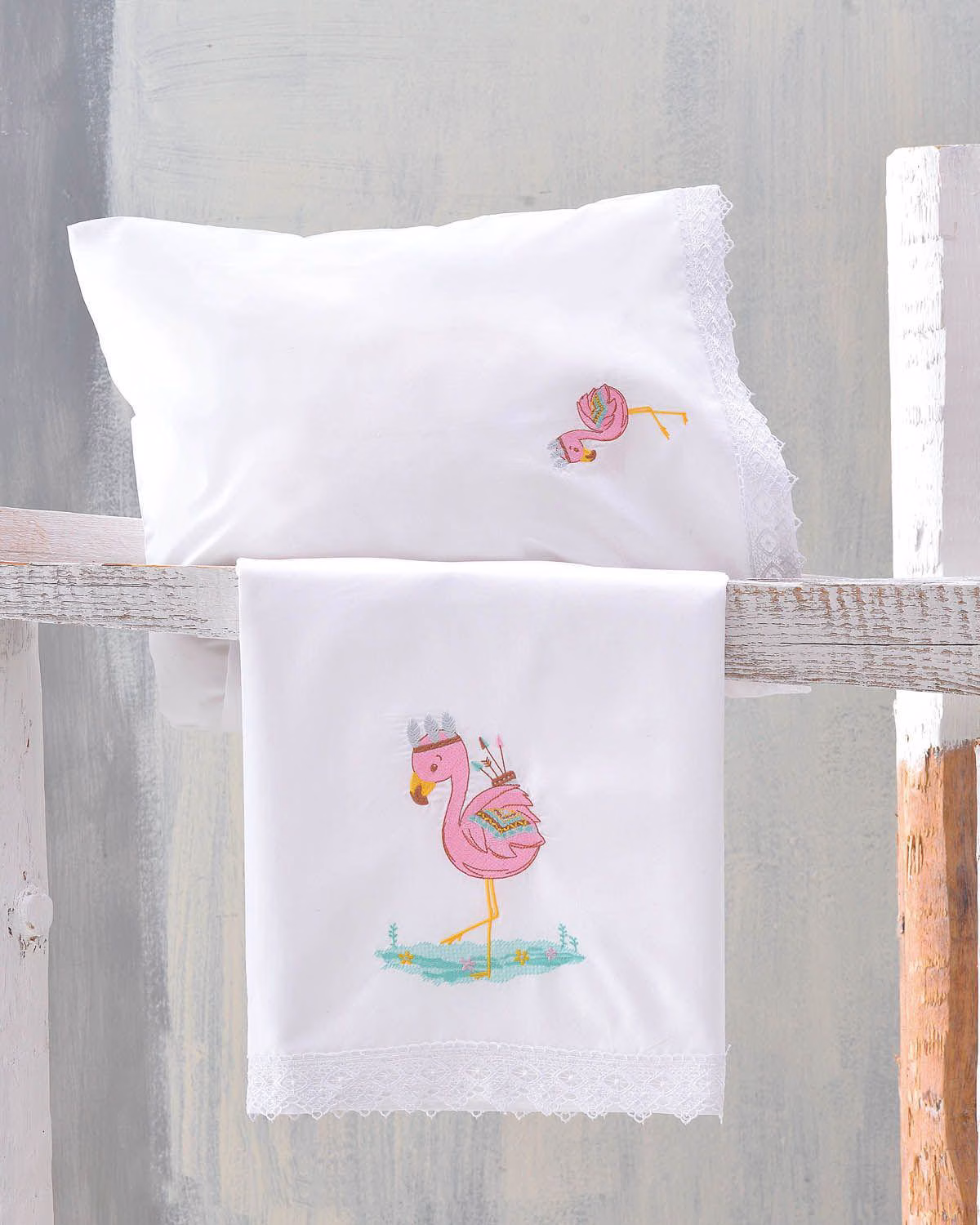 Σετ σεντόνια 3 τεμαχίων Flamingo από 100% βαμβάκι. Η συσκευασία περιέχει 2 σεντόνια 100Χ160 και 1 μαξιλαροθήκη 40Χ60.